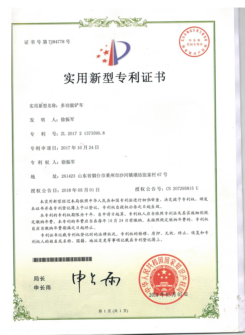 • 獲得“多功能鏟車抓掉挖一體機(jī)”專利證書(shū),開(kāi)始生產(chǎn)兩頭忙,攪拌斗裝載機(jī),同年更名萊州巨浪機(jī)械有限公司